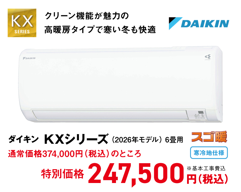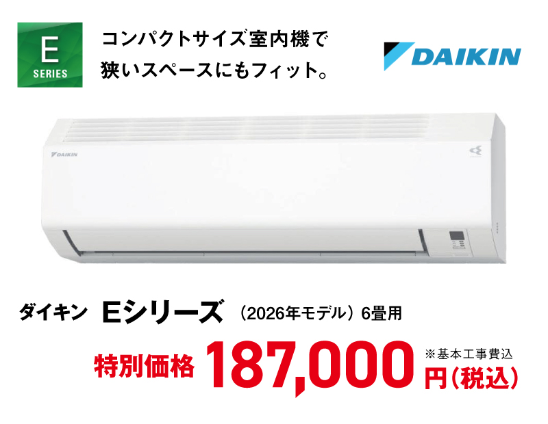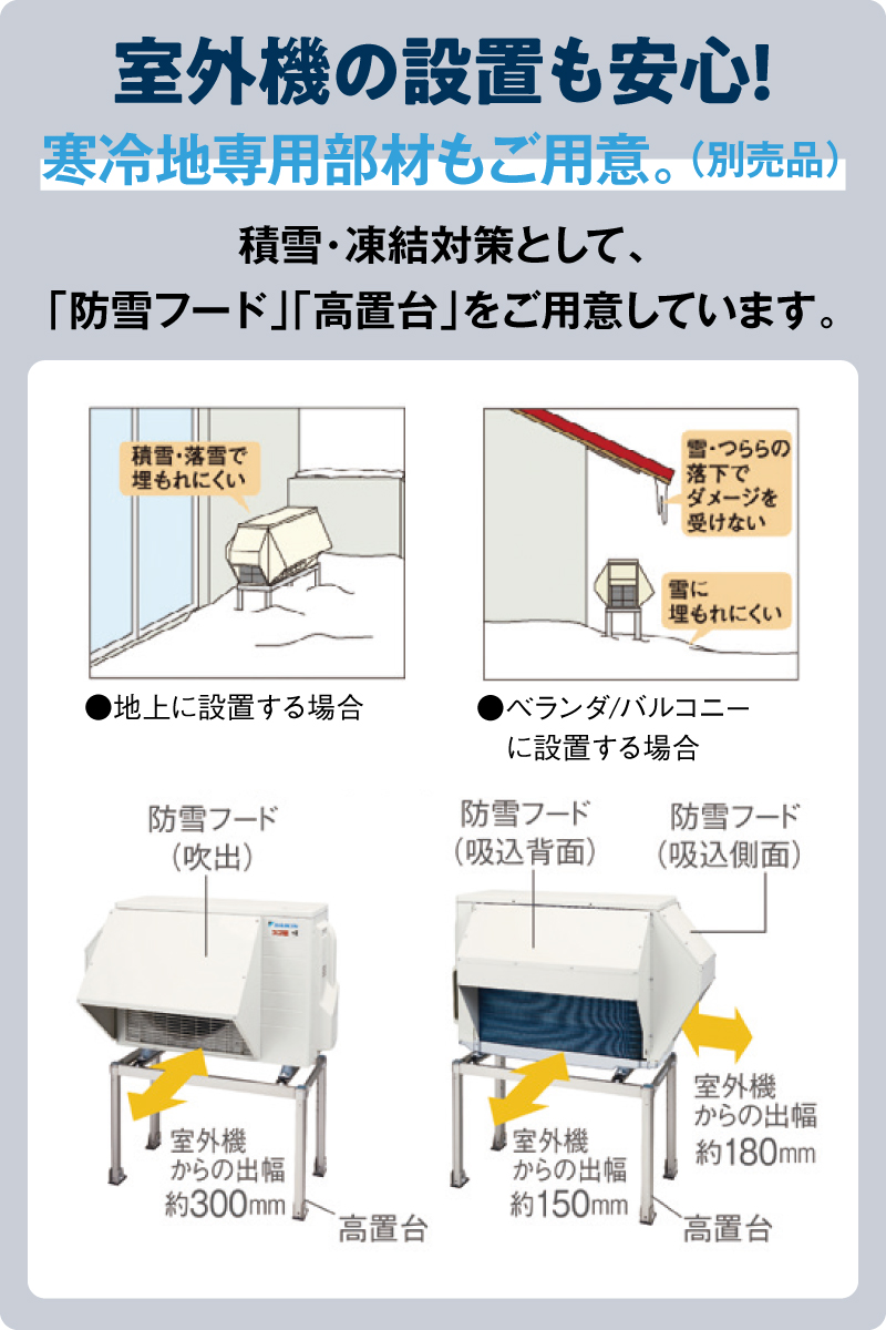 ※エアコン本体+基本工事には、エアコン室内機+室外機+穴開け1箇所+2m配管及び配管化粧カバー +プラロックが含まれます。(色未定) ※エアコン用コンセントを新規設置する場合は+100,000円(税込)~です。(設置個所により変動あり) ※室外機と本体の距離が遠い、設置個所が2階の場合は追加費用がかかります。 ※防雪フード等のオプションもございます。 ※マンションへの設置はできません。