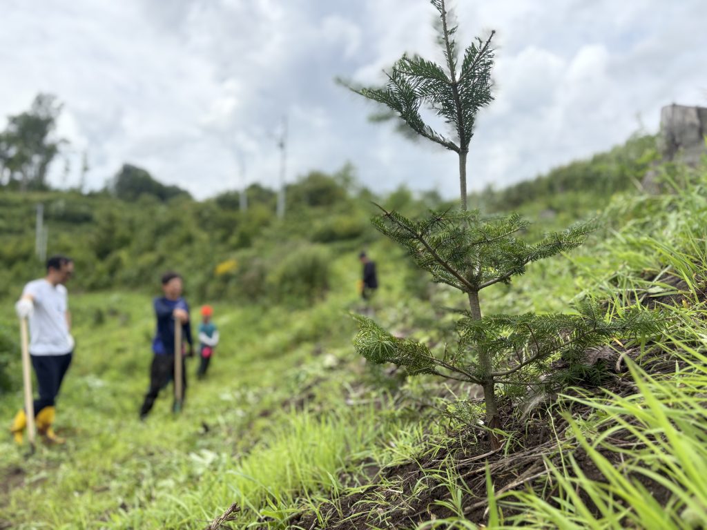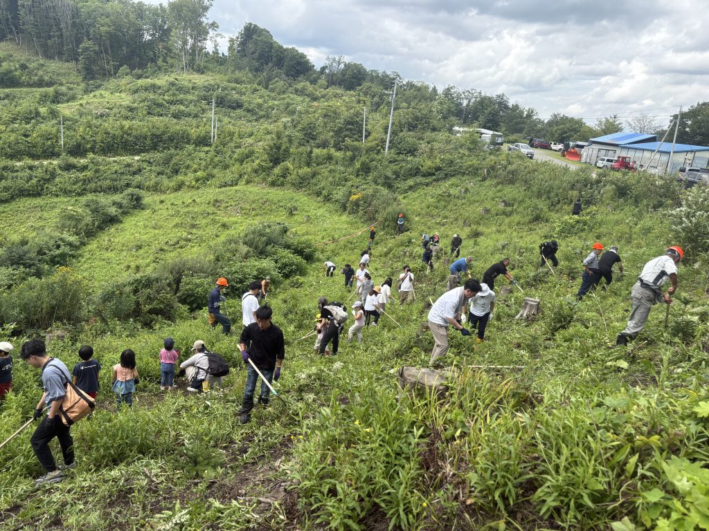 植樹の翌年に初回の下草刈りを実施し、今年(2025年)8月に二度目の下草刈りを行いました。傾斜地では足元を確認しながら区画ごとに分担し、町の職員や森林組合の方々のサポートのもと、安全に作業を進めました。
