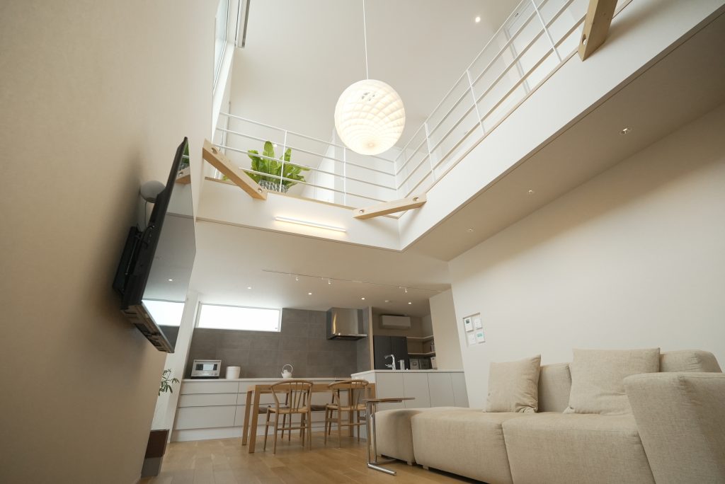 吹き抜けに映えるのは、インテリアショップ「inZONE(インゾーネ)宮の森店」で出会ったという『一生もの』の照明。
