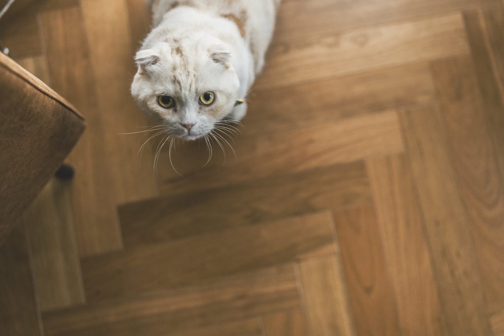 フロアをヘリンボーンにしたのもこだわりです。猫が滑るかなと心配しましたが、大丈夫でした。