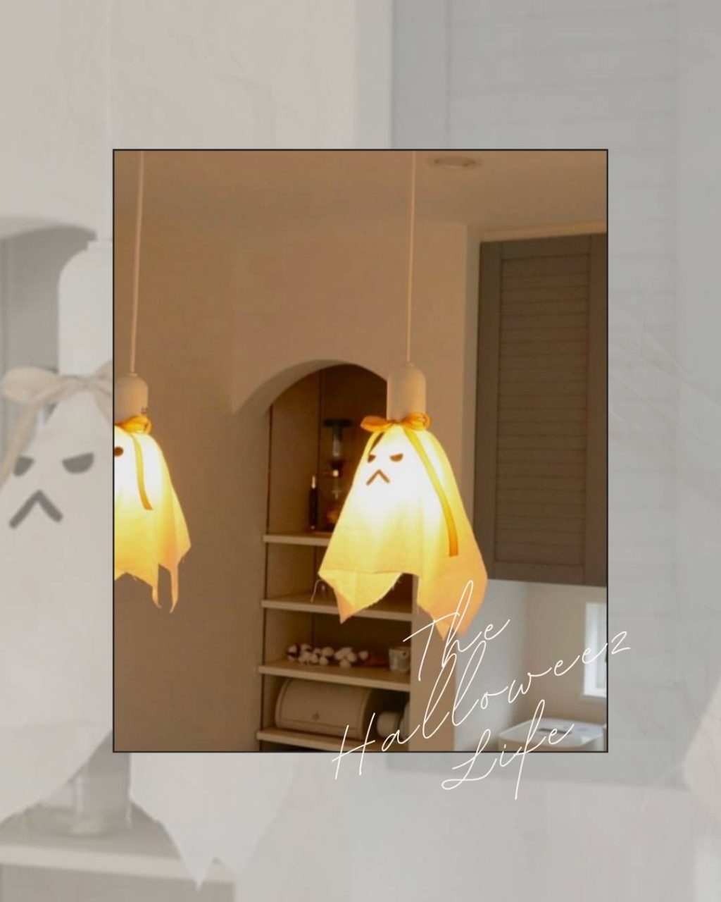 ✳︎ハロウィン🎃✳︎おばけのペンダントライト💡イベントを思う存分楽しむ国の方々のインスタを見て、今年はおばけライトをやりたい!と思っていました🥰娘が保育園に行っている間に作り、帰ってくるとどんな顔するかな〜とこちらもワクワクしながら作りましたが、とても大喜び!!『この子は〇〇してる顔で〜この子は〇〇してるの!』と嬉しそうに話しています☺️