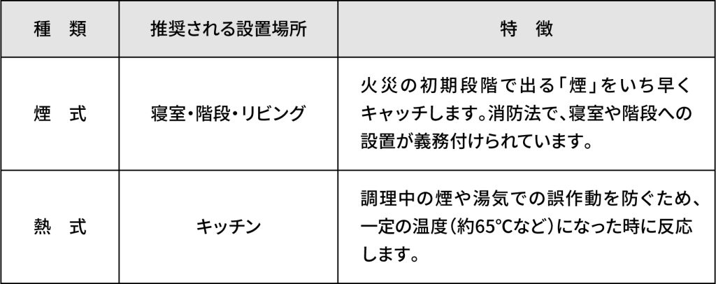 「煙式(居室・階段用)」と「熱式(台所用)」の2種類があるため、設置場所に合ったものを選んでください。
